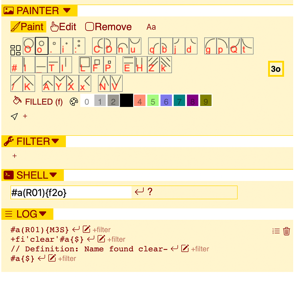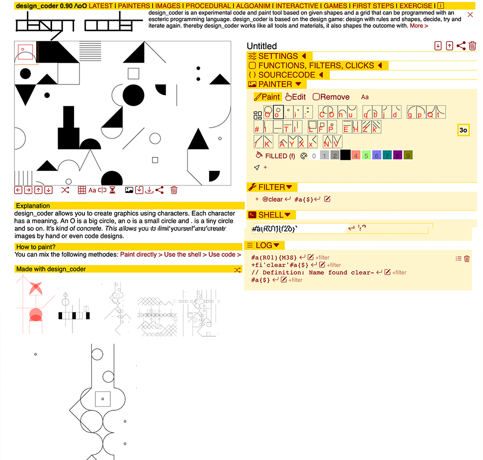 design_coder is an experimental code and paint tool based on given shapes and a grid that can be programmed with an esoteric programming language. design_coder is based on the design game: design with rules and shapes, decide, try and iterate again. thereby design_coder works like all tools and materials, it also shapes the outcome with.