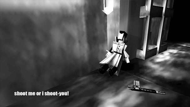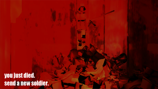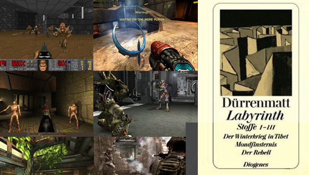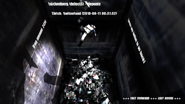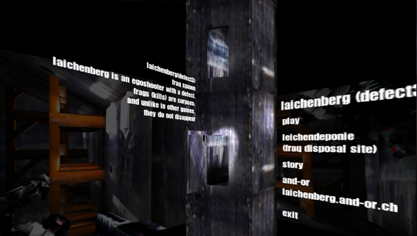 This GameArt project by AND-OR refers to Friedrich Dürrenmatt's narrative fragment "Winterkrieg in Tibet" (Winter war in Tibet). The famous writer and dramatist broke war down into the simple formula: never put the enemy in question. But what happens if there isn't an enemy anymore? If all of a sudden the enemy is amiss? Down in the bunker systems under the Himalayas time came to a standstill. Soldier 23 had battled his way through the rèduit systems of Switzerland and through wartorn neighbour areas during the war. He leaves his government behind, dozing in its federal parliament building bunker, deep down under the Blümlisalp mountain, and moves on to Tibet as a mercenary. There he finds new work and what is more important new enemies. The tunnels are littered with corpses, and eventually he has to finish off his former commander. "Hänschen, durchlöche mich mal!" (Little Jack, please put bullet holes in me!) he says. Or is it just an illusion? The endless killing? The steadily spawned new enemies? Killing or not killing. There is no choice! There is no escape from the (game-)labyrinth! The labyrinth quite simply is the location for experiments. A location at which only Minotaur waits or according to Dürrenmatt your alter ego awaits you. There is no other way but shooting the others; all of the rest. In the underground systems of the Himalayas the corpses pile up. Soldier 23 has to substitute his legs with rolls and his arms with weapons. In the end, all that remains for him is scribble on the wall, meter for meter, back and forth. laichenberg means mountain of spawning (german: "laichen") and piles of corpses (german: "Leichen"). In an apocalypse it shows how a simple defect alters a game. laichenberg does not make the dead disappear such as firstperson shooters usually do. The effect is that soon enough there is no space left in the labyrinth to play anymore.