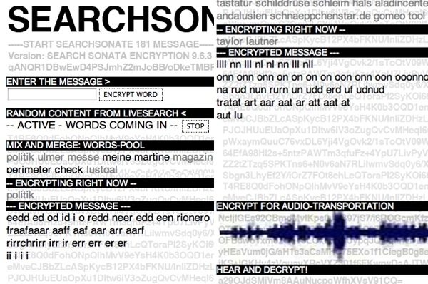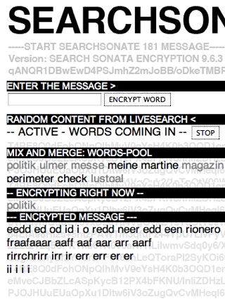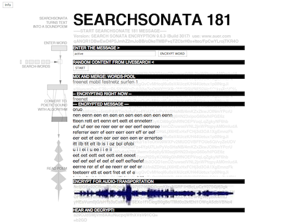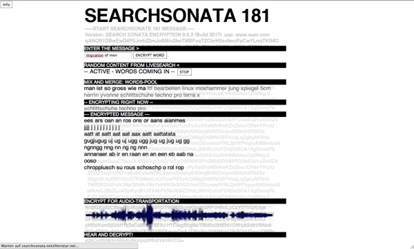 SearchSonata 181 is a highly complex mesh of language, encryption and tonality. It features interaction between human being, machine and net communication, between text input, text encryption, sound poetry, programming and real-time streams of words of a live search. SearchSonata 181 is meant to be performed live. A beta-performance was given at the Bardinale Festival in Dresden (2010). The premiere was held at the Filmwinter 2011 Festival in Stuttgart on january 19, 2011. Searchsonata 181 was interpreted by Regina Spindel. A simplified and very functional interface by johannes auer is used for live-performances. Searchsonata 181 also has a different and distinct web interface that shows all steps of the soundpoetry process. Web visitors may participate in generating encryption-soundpoetry by input into the interface. It is suitable for installations as well. For the Filmwinter (2011) show "Ten Rooms Special", a separate start for the search trilogy was installed.SearchSonata 181 is a collaborative project of Johannes Auer and AND-OR.