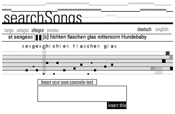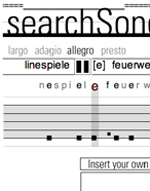 SearchSongs captures the stream of words of Lycos' live search. This stream of words might be understood as an expression of collective desire, as the net's melody of yearning, which is played by thousands of people, who at any moment try to reach the desired by means of a search engine. This melody of yearning is made audible by SearchSongs. Words contain playable tones of the musical notation system (c, d, e, f, g, a, h, c, fis, ces ...). On one side SearchSongs' web interface shows the stream of words of the live search, on the other side there are lines of musical notes below which transform playable letters in musical notes. Non-playable letters define the length of a tone. In ancient Greece there already was a notation system of letters which was used for indicating the pitch of a tone, and the length of a tone was marked with a symbol written above the letter. A traditioned example is the Seikilos epitaph dated from the second century B.C. The most well known example of a word set to music by a letter notation system is the B-A-C-H motif, which Johann Sebastian Bach repeatedly used in his compositions. SearchSongs refers to traditional letter notation systems like the Seikilos epitaph and the B-A-C-H motif. SearchSongs accentuates the correlation between letters and notes in a more determined and concrete way. Furthermore the theme of musical improvisation is juxtaposed by a random generator, and the strict rules of the musical notation system is antagonized by algorithme. In this respect at the end the subjective search is being objectivized by the melody of the SearchSongs. Concept