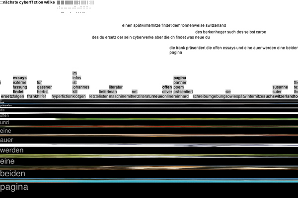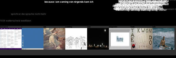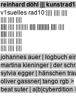 reinhard döhl johannes auer: log-book of a common journey sylvia egger: piep-show oliver gassner: tango rgb martina kieninger: der schrank. die schranke. The visual radio project is part of the cooperative work "The Famous Sound of Absolute Wreaders" curated by Johannes Auer for the Kunstradio show of the Ö1 (Austrian Broadcasting). It is a multi-layer-scrabble which uses internet, search and code for visualizing Reinhard Döhl's source texts. Words and sentences become the plaything of interpretation while as the original source-projects by five authors still shine through. How would you visualize the tango of colours which were translated into rhythmical words by a concrete poet? How would you visualize a log-book which secretely reads all visitors identifications? Concept
