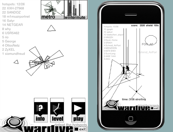 >wardive video - strolling/get a bus (6.2mb) >the environment - your 'enemy' - pictures >press about wardive >wardive was first released on nintendo ds (homebrew) wardive captures the wlans in the immediate area like a wardrive-tool and creates a game. it reads the names of the hotspots in your immediate area and turns them into enemies which try to take over your wardive-crystal. try to fend them off with your touch pen, put your shields up. and don't just stay in one spot. take metro-wardive for a walk or on a ride through town. find out how may enemies hide in the area you are in or pass through. each time you play, metro wardive captures different data and creates a new level for you. metro wardive is an adaptive game with locative levels. it changes according to its real life location as much as to its virtual data world.