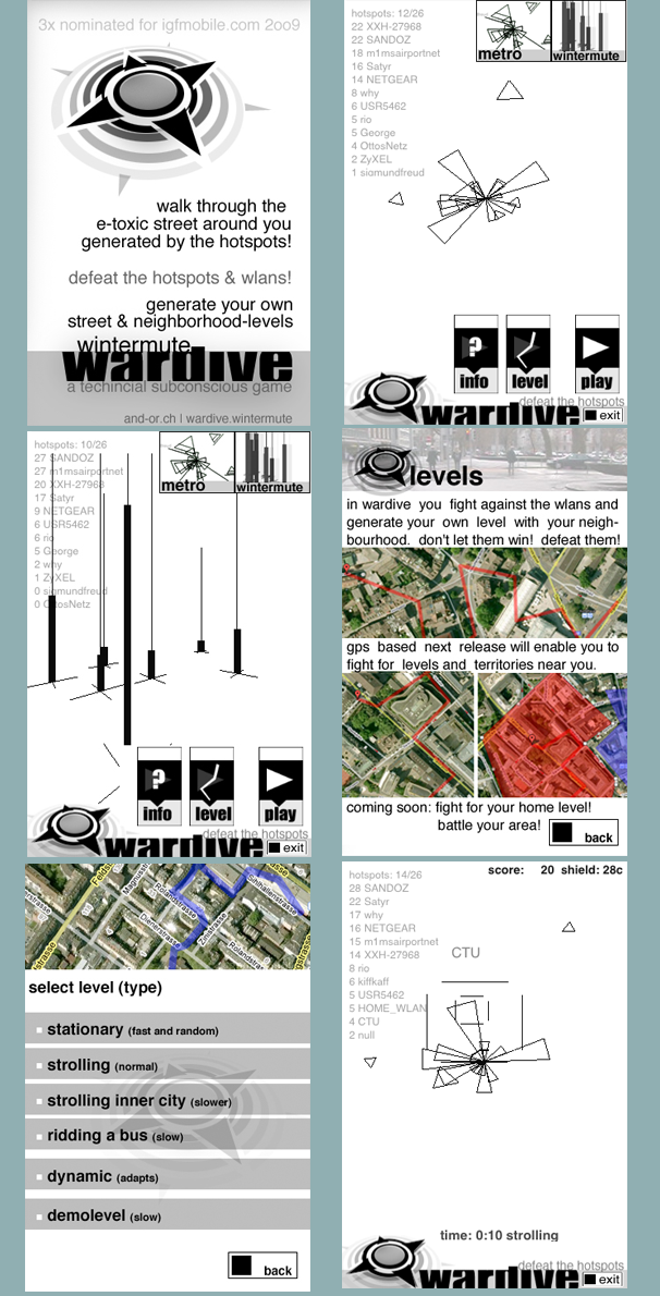 wardive is an adaptive game with locative levels. the game adapts its level according to the environment of the player, his or her location and mobile or stationary position. it works as an automatic level editor which adapts to change of position and data-flow. Generate your own levels in your hometown or in any location!